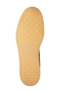 Panels of calfskin suede and recycled nylon bring dimension to this low-top sneaker featuring a perforated toe and three versions of the iconic Prada logo. Lace-up style Removable insole Leather and textile upper and lining/synthetic sole Made in Italy Designer Shoes