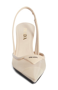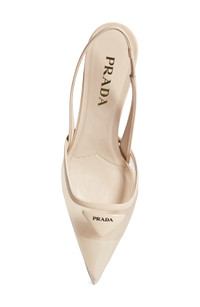 A pointy toe and a sculptural heel frame the streamlined profile of this slingback pump crafted from sheer, fine-gauge mesh and leather and punctuated with a puffed-up take on Prada's iconic triangle logo. 3" (75mm) heel Elasticized slingback strap Textile and leather upper and lining/leather sole Made in Italy Designer Shoes