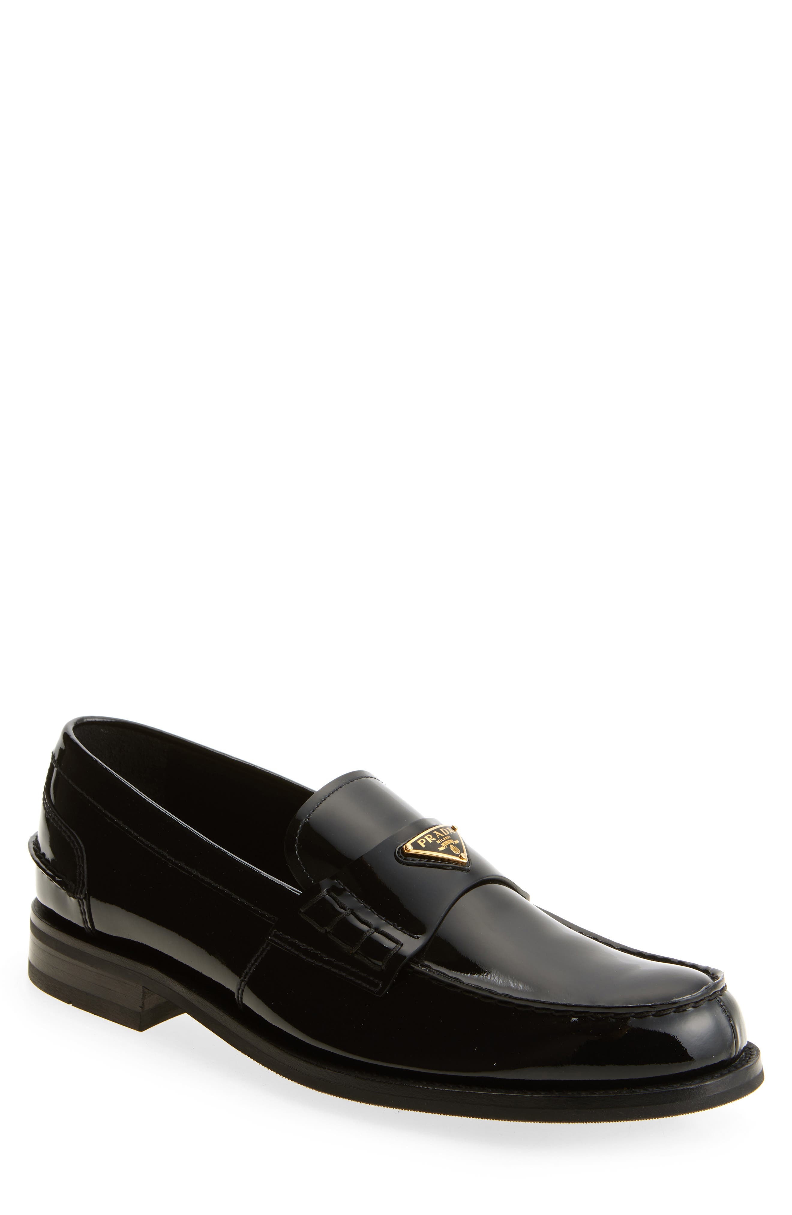 Prada reimagines the classic penny loafer with this moc-toe shoe crafted of glossy calfskin leather and detailed with an iconic triangular logo. Leather upper and lining/rubber and leather sole Made in Italy Designer Shoes