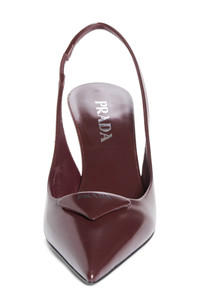 A pointy toe and sculptural heel frame this slingback pump crafted of burnished calfskin leather and finished with a puffy take on Prada's iconic triangle logo. 3" (77mm) heel Elasticized slingback strap Leather upper and lining/leather and synthetic sole Made in Italy Designer Shoes