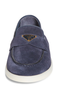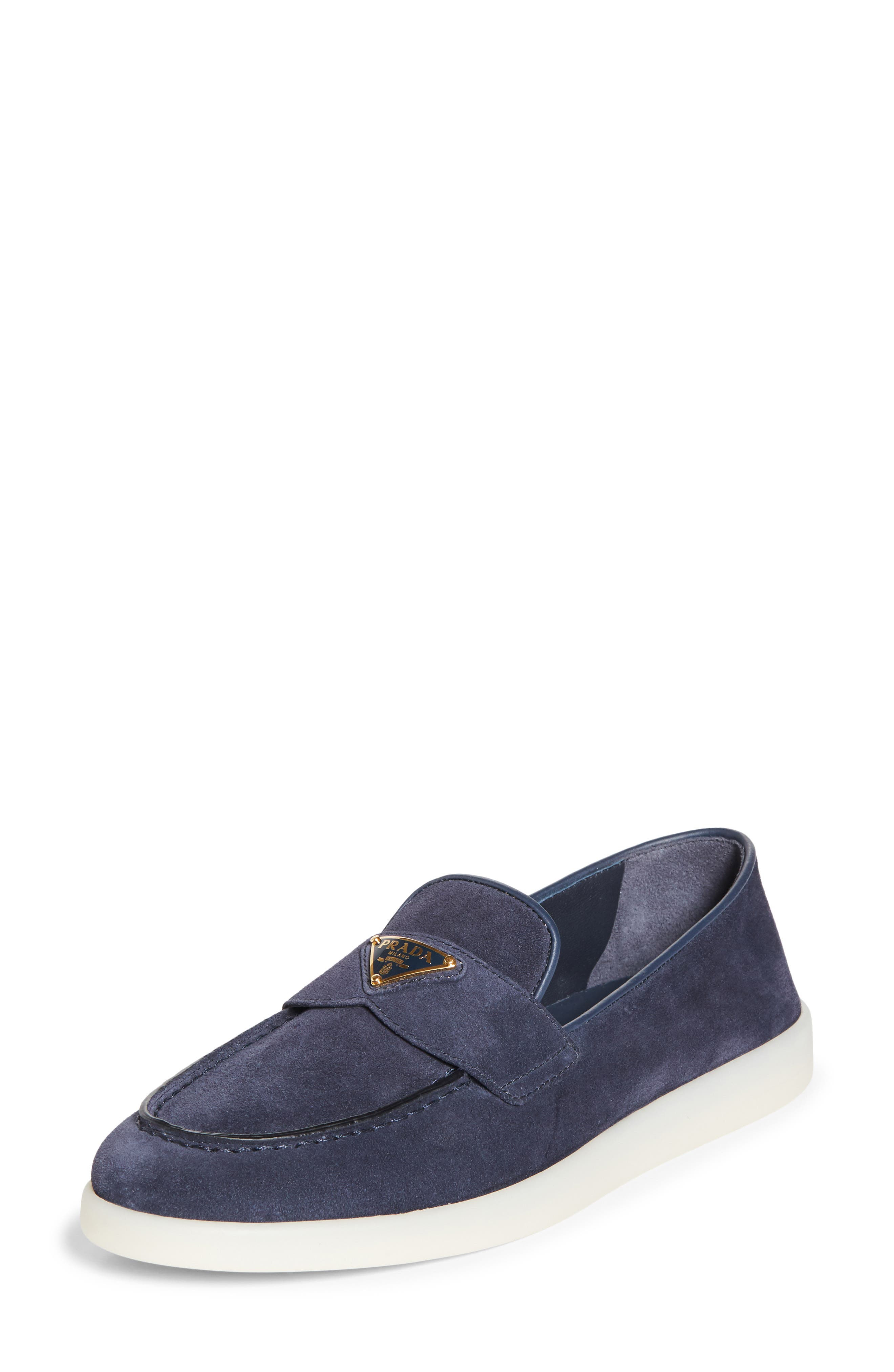 Prada's iconic triangular logo shines at the keeper strap of this easygoing loafer crafted of velvety suede and grounded by a grippy rubber sole. Leather upper and lining/rubber sole Made in Italy Designer Shoes