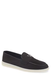 Prada's iconic triangular logo shines as the penny stand-in on the keeper strap of this easygoing loafer in velvety suede and grounded by a grippy rubber sole. Removable insole Leather upper and lining/rubber sole Made in Italy Designer Shoes