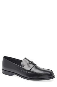Prada's iconic triangular logo shines on the keeper strap of this polished loafer meticulously crafted in Italy from smooth calfskin leather. Leather upper and lining/leather and rubber sole Made in Italy Designer Shoes