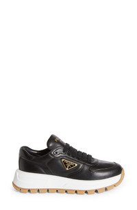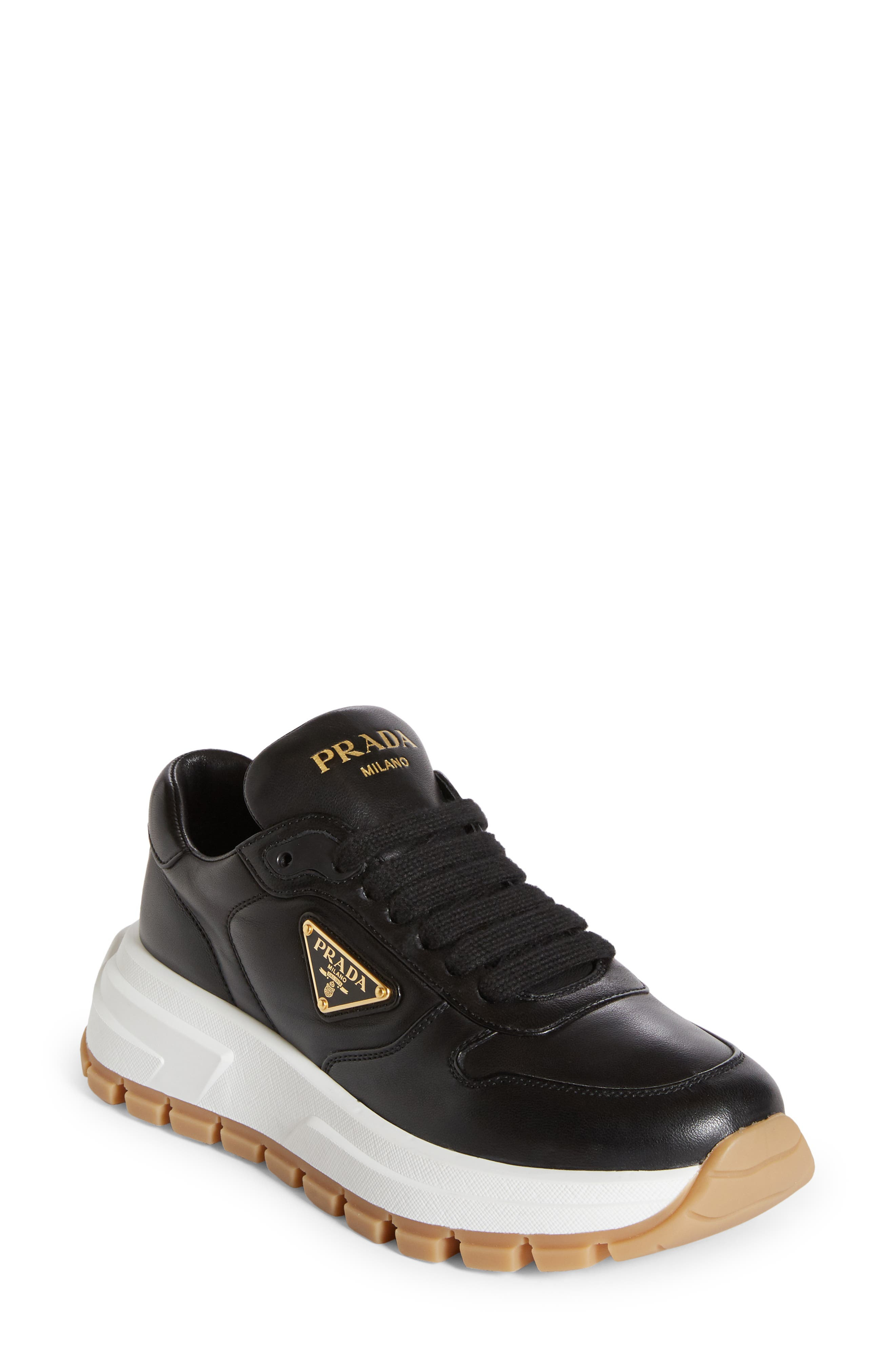 Prada's iconic triangle logo brands the sidewall of this court-inspired sneaker featuring a mixed-media upper set in a cupsole with triangular tread. Lace-up style Leather and textile upper and lining/synthetic sole Made in Italy Designer Shoes