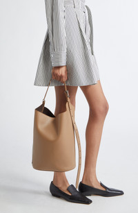 This spacious bucket bag is crafted from smooth calfskin leather and easily transforms from shoulder to crossbody carry by unclipping the collar stud and sliding it through the strap. A tethered zip pouch makes it easy to secure and quickly locate your essentials. Toggle belt closure Adjustable shoulder strap Removable tethered zip pouch Structured silhouette with flat base for stability Unlined Leather Imported Designer Handbags