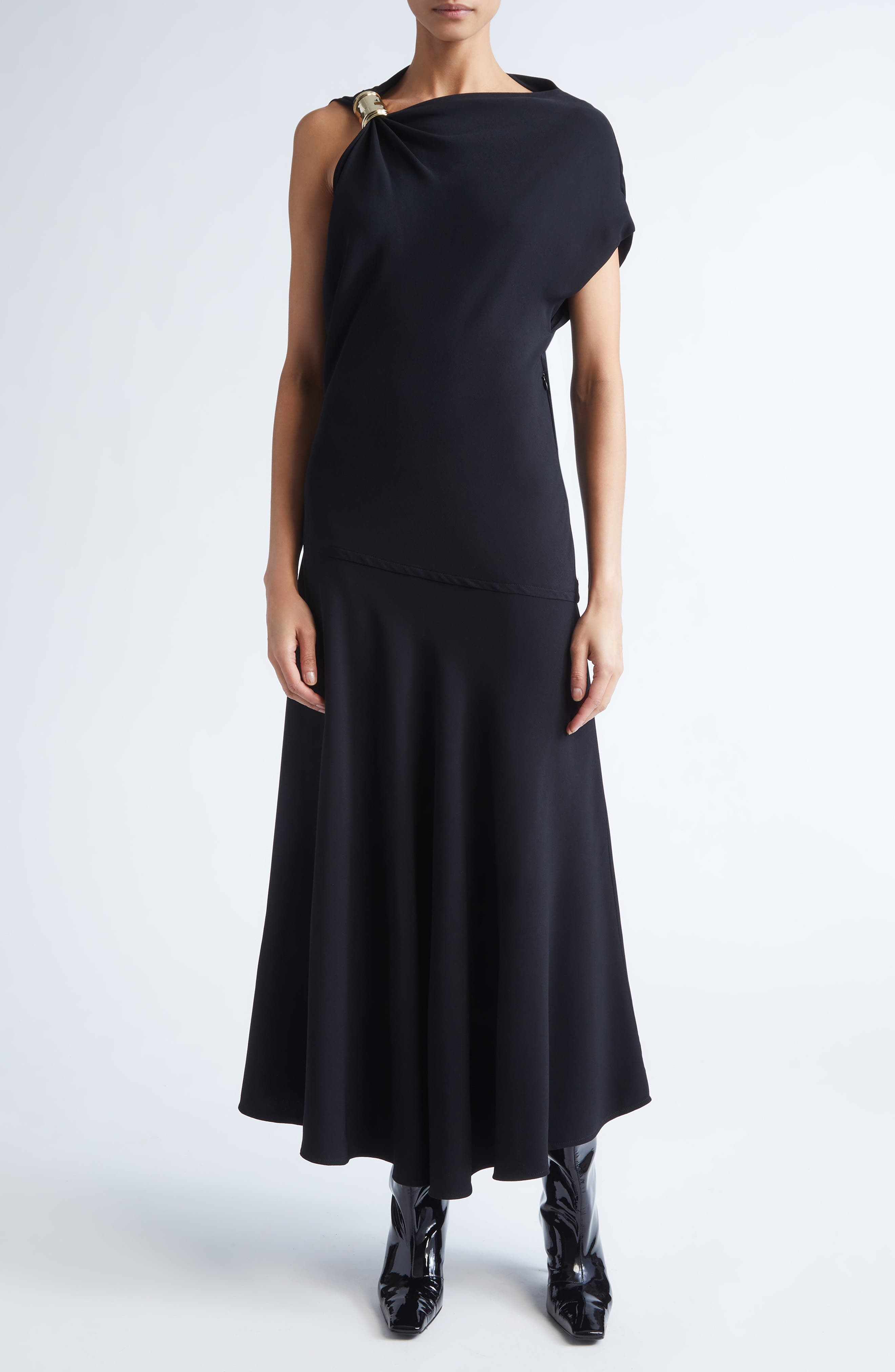 Gleaming tubular hardware highlights the asymmetric neckline of this fluid dress fashioned from matte-finish double-face crepe. Hidden side-zip closure Asymmetric neck Sleeveless 72% acetate, 28% polyester Dry clean Made in Italy Designer Clothing