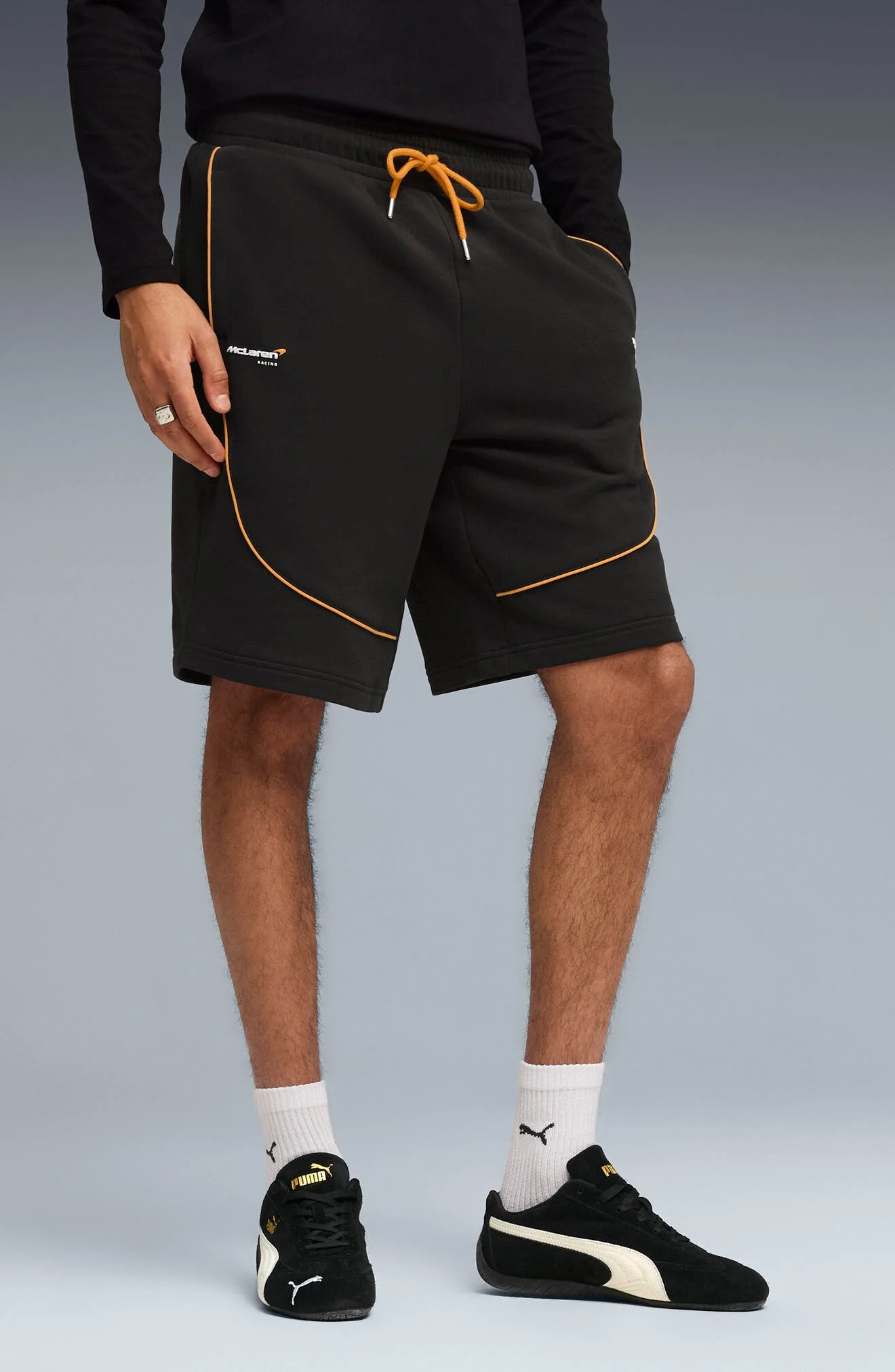 Bring the McLaren mindset into your casual rotation with cotton-blend shorts featuring bright piping that hits like a clean launch off the starting line. 10" inseam Elastic/drawstring waist Side-seam pockets 68% cotton, 32% polyester Machine wash, tumble dry Imported