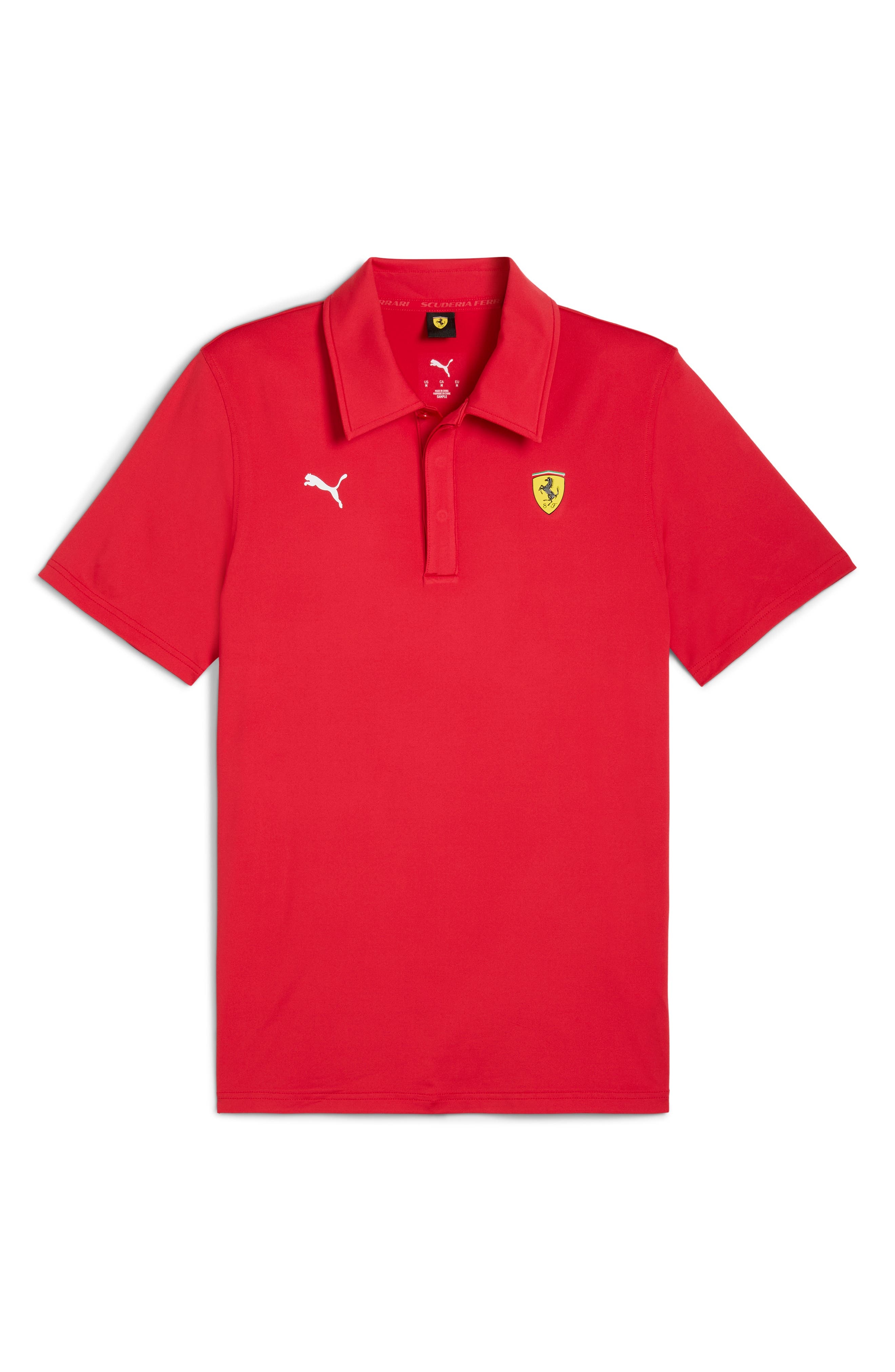 PUMA harnesses the Ferrari energy of its Scuderia Ferrari racing team in this sleek Formula 1 polo sporting a PUMA Cat and the team's iconic Prancing Horse logo. Let it rev up any casual look with a championship vibe that never puts on the brakes. Hidden-button half placket Spread collar Short sleeves 93% polyester, 7% elastane Machine wash, tumble dry Imported