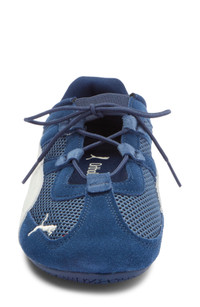 An open top bridged by slender laces pairs with fishnet-inspired mesh to downshift the turbocharged energy of a sneaker with a racer silhouette and a winning sense of style. An embroidered PUMA Cat pounces across the T-toe. Pull-on style with elastic laces Textile and leather upper/textile lining/rubber sole Imported