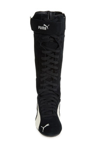 A towering, contour-hugging silhouette revs up the energy of a plush suede sneaker boot designed with a streamlined racer foot and a tread wrapping up the heel to keep the pedal to the floor. The shaft secures in place with lacing, zipping and a wraparound strap for custom-fit comfort, while an embroidered PUMA Cat on the toe maintains the enduring fan-favorite pace. Lace-up style; side zip closure; wraparound hook-and-loop strap Leather upper/textile lining/rubber sole Imported
