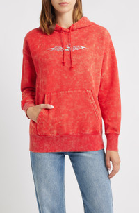 Stonewashing creates a mottled effect in a bright and lightweight hoodie centered with a tactile metallic logo. Drawstring hood Kangaroo pocket Ribbed cuffs and hem 66% cotton, 34% polyester Machine wash, dry flat Imported