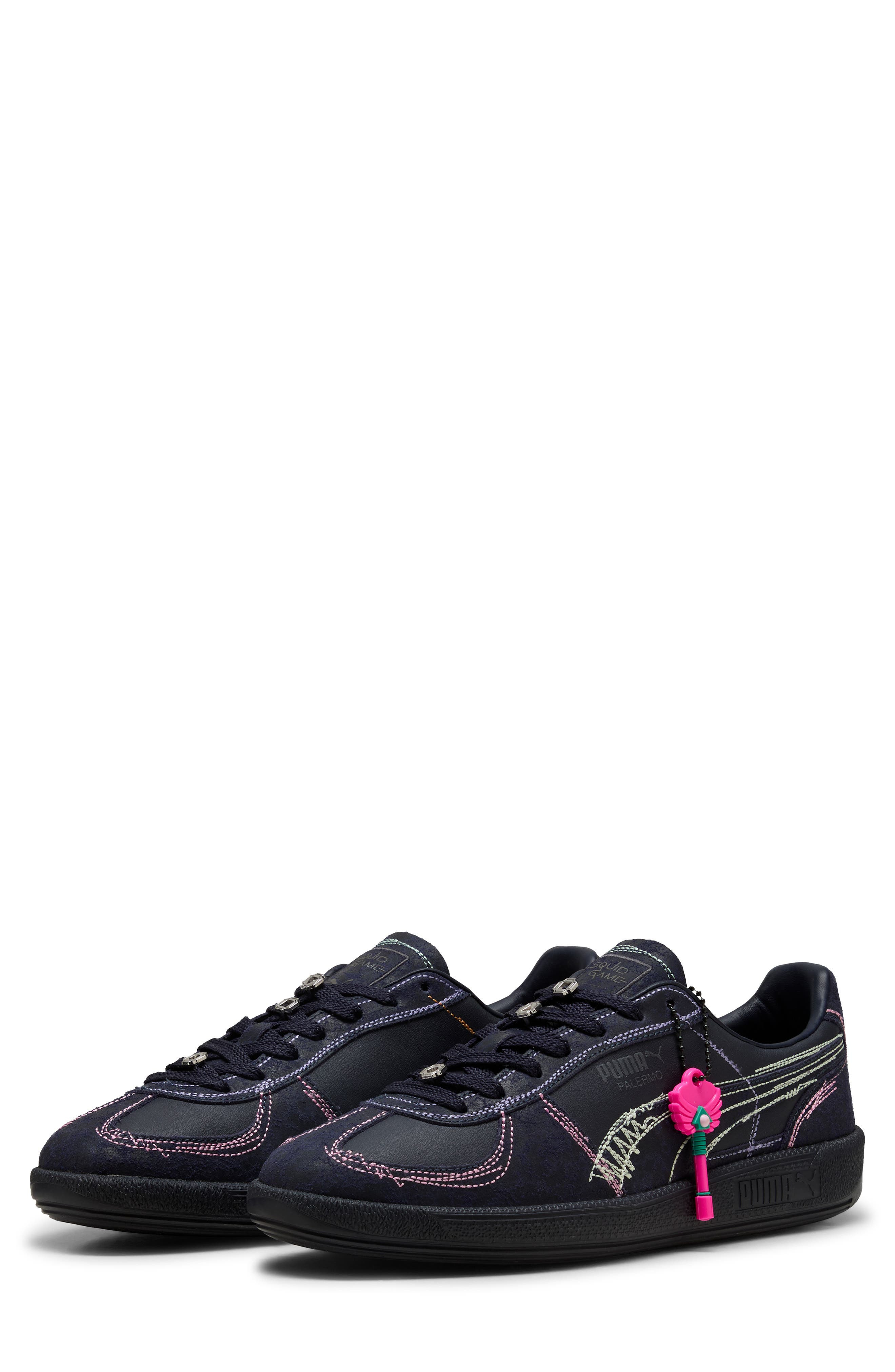 Circle, triangle and square hardware anchors the laces of a heritage PUMA sneaker that's been conscripted into the color-coded 'Squid Game' universe. It still sports the low profile and T-toe construction of its soccer inspiration, but now the stakes are higher, the masks are off and the style game is on. Lace-up style Leather and synthetic upper and lining/rubber sole Imported