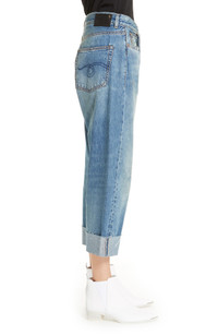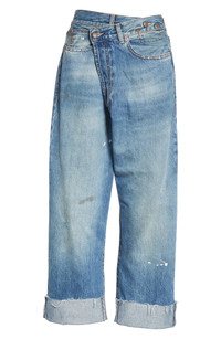 A deconstructed, asymmetrical front lends a cool industrial vibe to paint-splattered jeans cut with a flattering high waist and easy wide leg. Frayed cuffs that hit just above the ankle further the old-favorite attitude. 24" rolled inseam; 27" unrolled inseam; 14 1/2" front rise; 16" back rise; 17 1/2" leg opening (size 29) Zip fly with asymmetrical button closure Five-pocket style 100% cotton Machine wash, line dry Made in Italy SPACE: A shop for emerging and advanced designers
