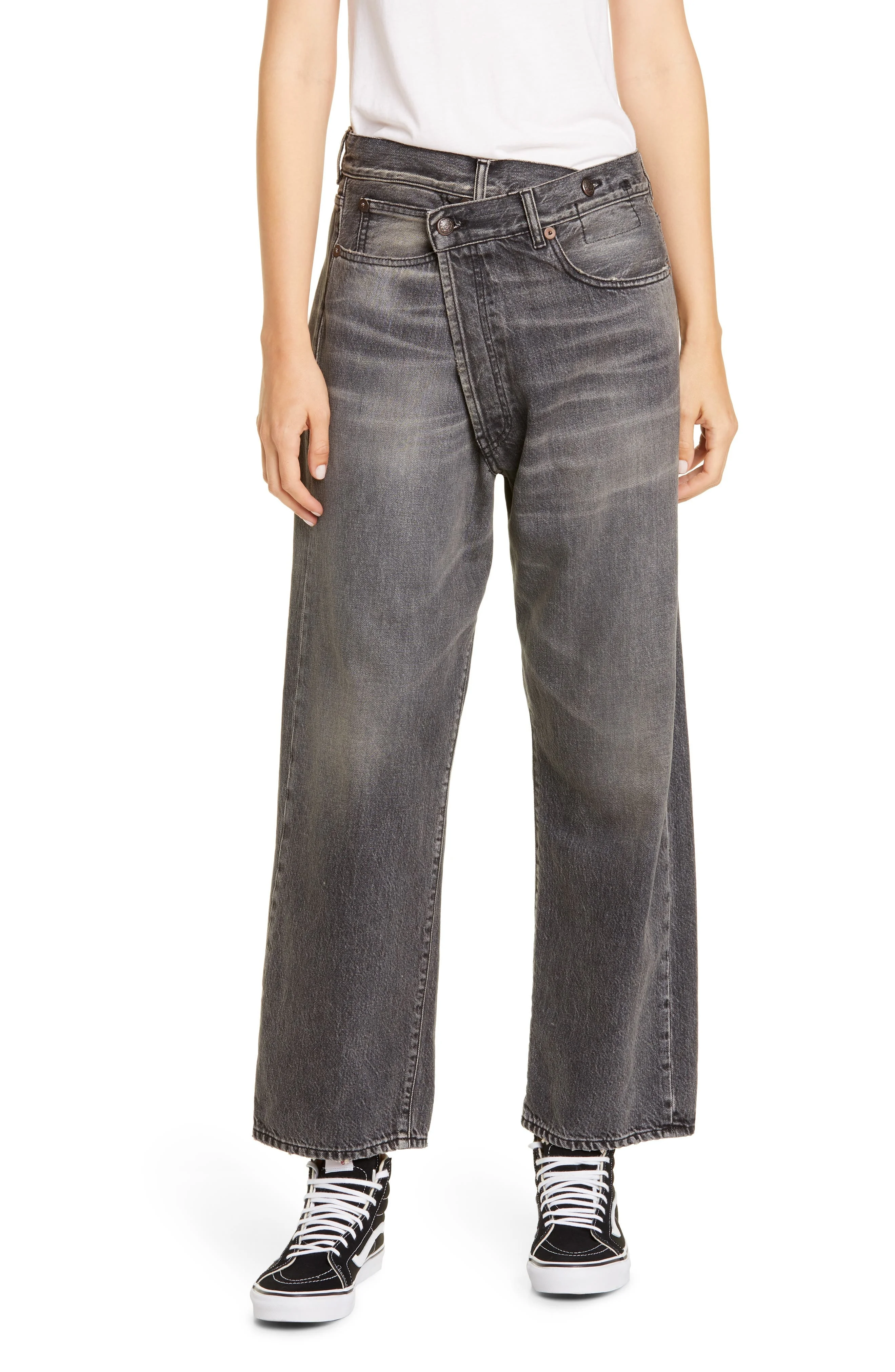 A deconstructed, asymmetrical front lends a cool industrial vibe to faded and whiskered black jeans cut with a flattering high waist and easy straight leg. 27" inseam; 16" leg opening; 15" front rise; 16 1/2" back rise (size 29) Zip fly with asymmetrical button closure Five-pocket style 100% cotton Machine wash, line dry Made in Italy SPACE: A shop for emerging and advanced designers
