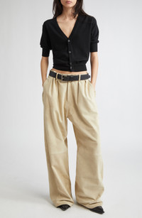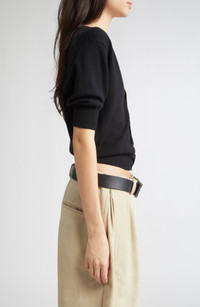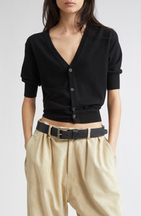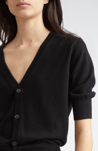 A fitted waist adds playful volume to the relaxed silhouette of this lookbook-featured cardigan knit from soft merino wool yarns and finished with chic elbow-length sleeves. Front button closure V-neck Elbow-length sleeves Ribbed cuffs and hem 100% merino wool Dry clean Imported Designer Clothing