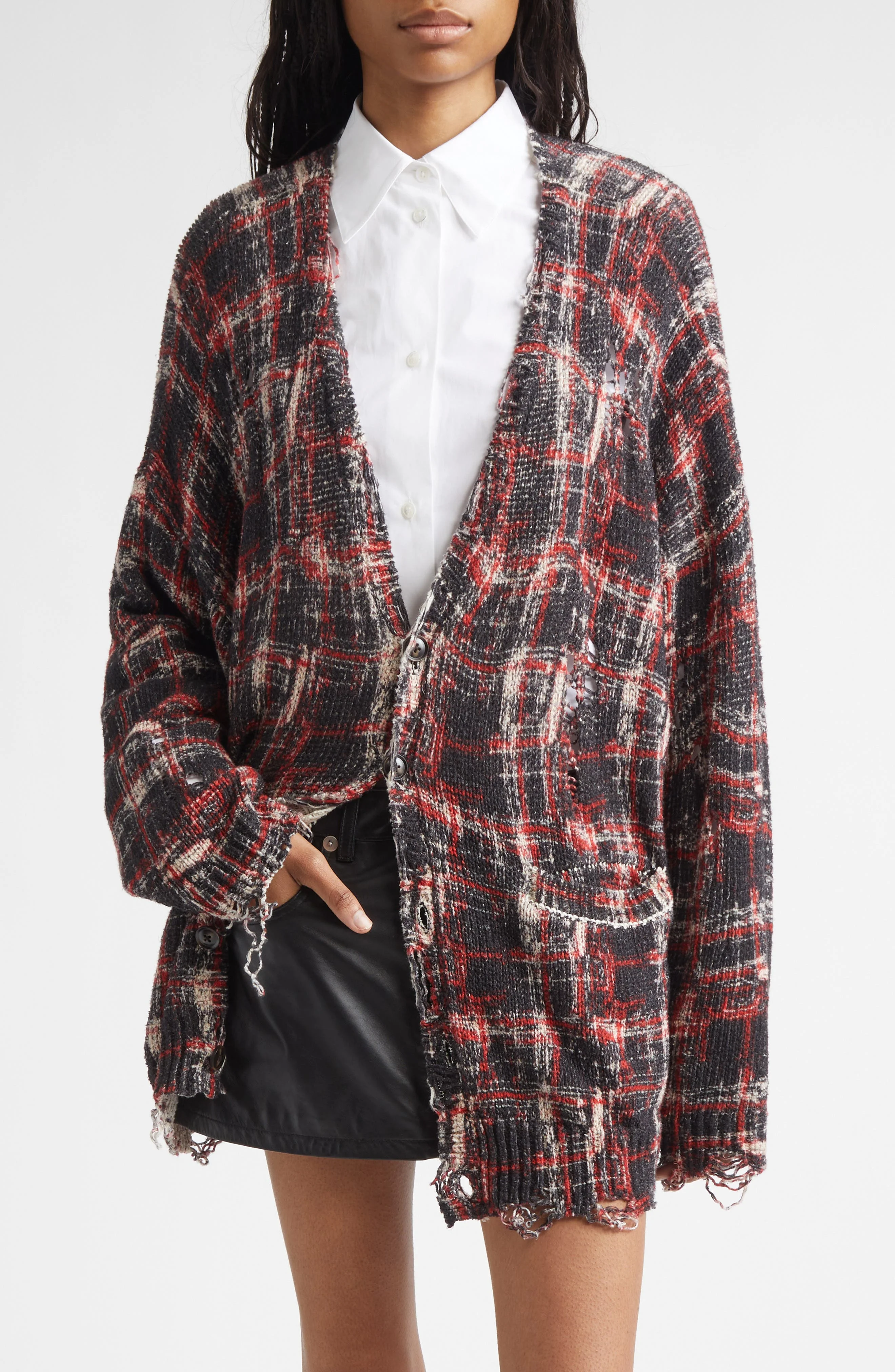 R13 Oversize Distressed Plaid Linen Blend Cardigan in Black/Red/White Plaid at Nordstrom