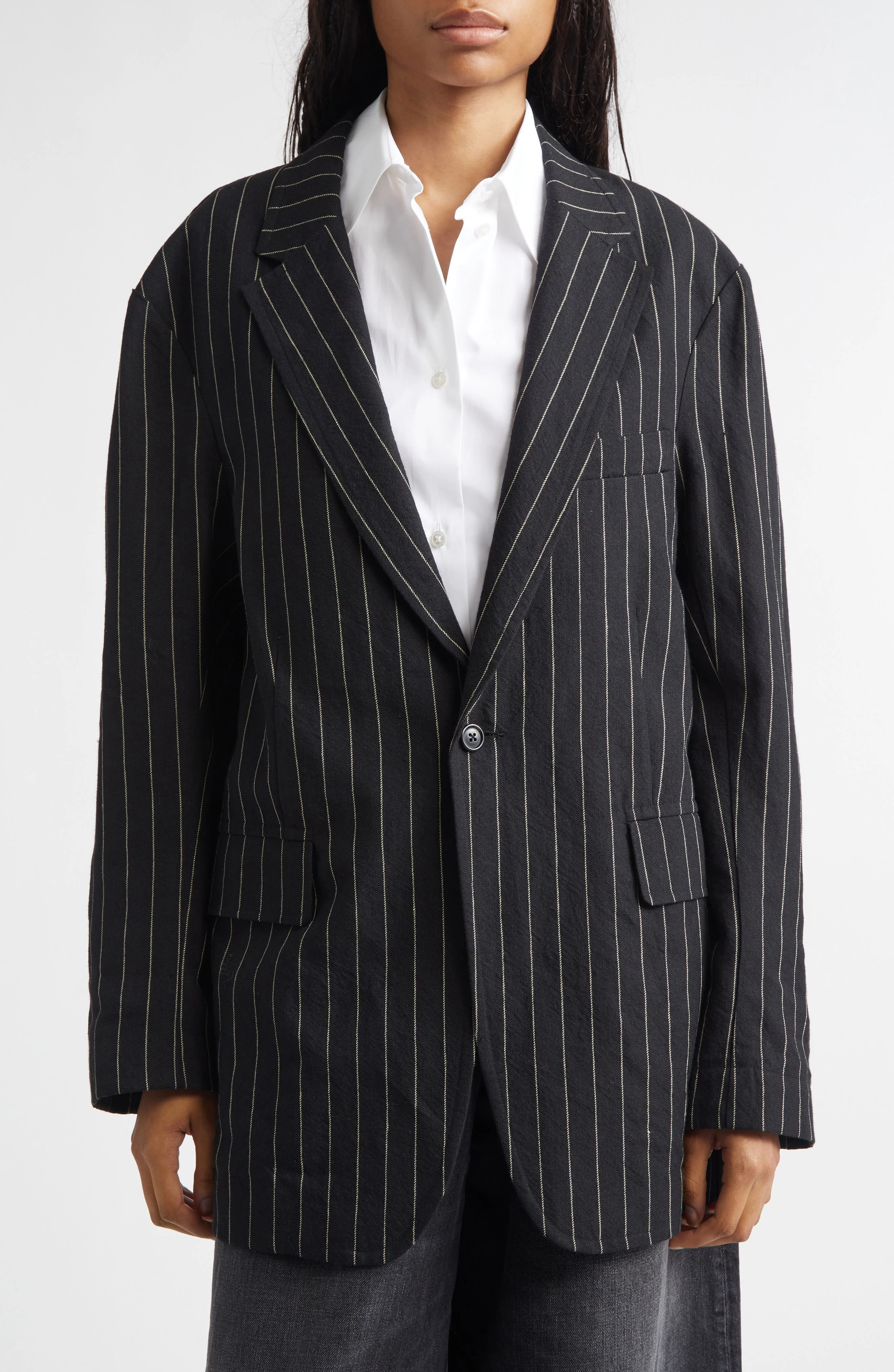 R13 Ragged Pinstripe Oversize Linen & Virgin Wool Blazer in Black White Pinstripe at Nordstrom