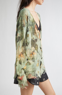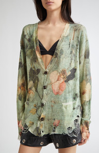 For prefall '25, Chris Leba stays true to his roots with punked-up flora he deems 'pretty but a little dark.' Take, for example, the moody bouquet haphazardly scattered on this lightweight linen cardigan given the New York designer's typical '90s-grunge treatment via threadbare rips and gnarled edges. Front button closure V-neck Long sleeves Dropped shoulders Ribbed cuffs and hem Front patch pockets 100% linen Hand wash, dry flat Imported Designer Clothing