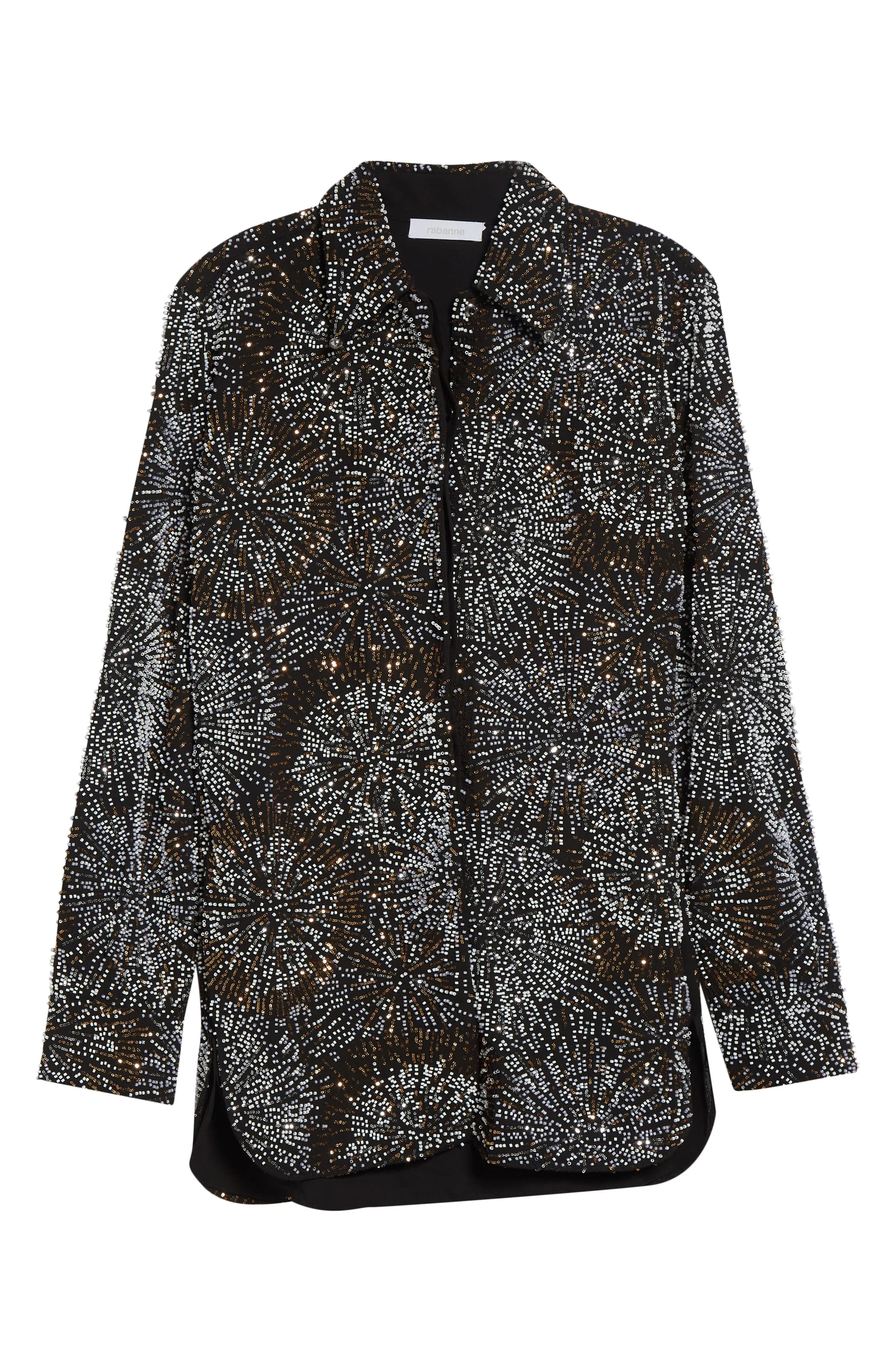 Evoking signature Rabanne shine, scores of light-catching sequins and beads erupt in a dazzling firework display across this fluid crepe shirt from the spring '26 collection—Julien Dossena's open dialogue between celebration and subversion. Hidden-button placket Point collar Long sleeves with button cuffs Curved hem Side slits 100% polyester Dry clean Imported Designer Clothing