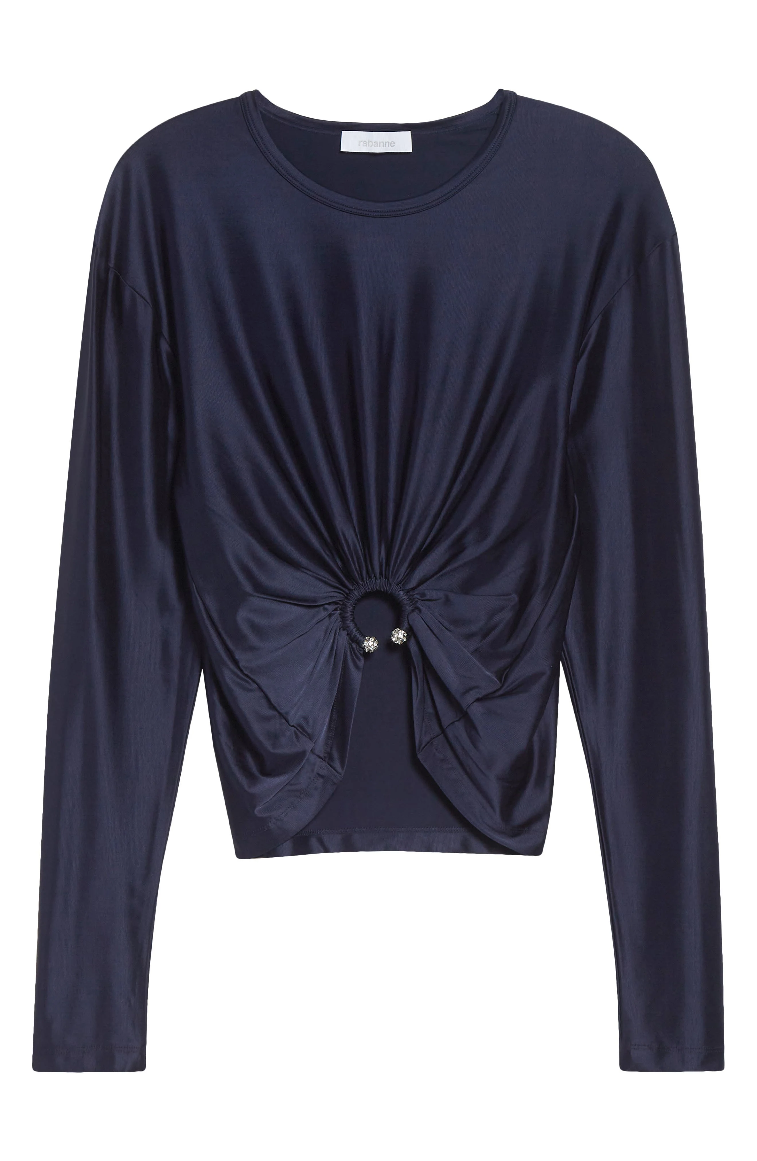 Julien Dossena takes a softer—yet equally alluring—approach to Rabanne’s signature shine with this artfully draped stretch-satin top, where crystal-studded ring hardware pierces the hiked-up hem. Crewneck Long sleeves 90% viscose, 10% elastane Dry clean Made in Portugal Designer Clothing