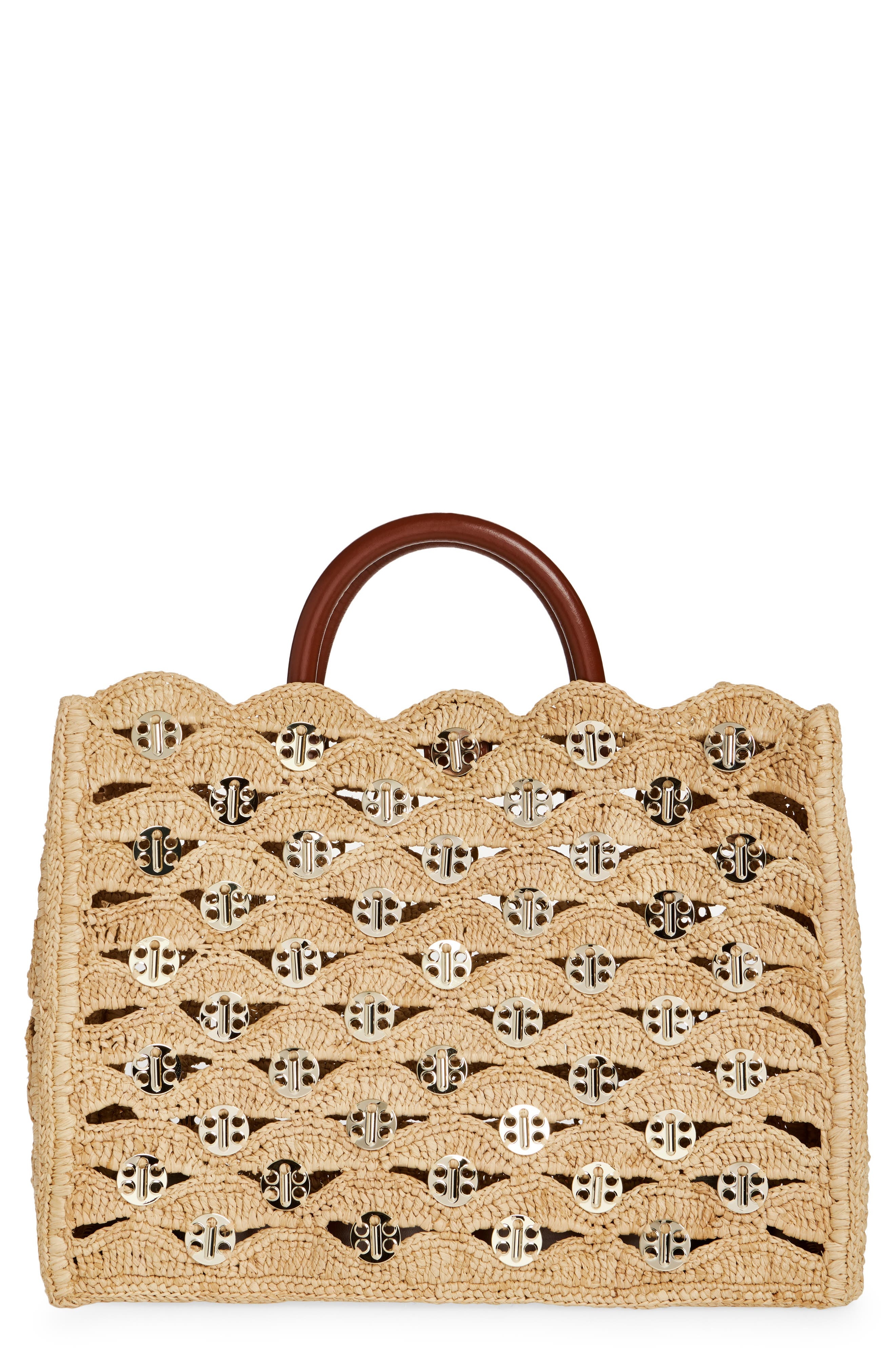 Rabanne's signature discs are woven into the lightweight raffia of a summery tote built in a lightly structured silhouette topped with rolled leather handles. Open top Top carry handles Raffia/leather/brass Imported Designer Handbags