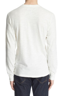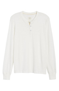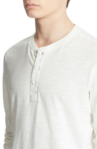 A smooth woven placket adds subtle textural contrast to a soft three-button henley cut from slubbed, jersey-knit cotton. 28 1/2" length (size Medium). Ribbed cuffs. 100% cotton. Machine wash cold, tumble dry. By rag & bone; imported.