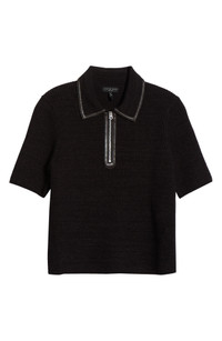 Faux-leather piping trims the collar and exposed zip of this short-sleeve sweater-polo knit in a ribbed stitch from wool-blend yarn eased with a hint of stretch. 20" length (size Small) Half-zip closure Spread collar Short sleeves 94% wool, 5% polyamide, 1% elastane with faux-leather trim Dry clean or machine wash, dry flat Made in Turkey