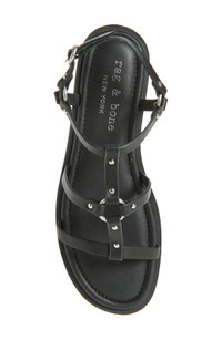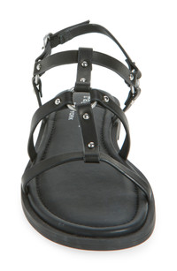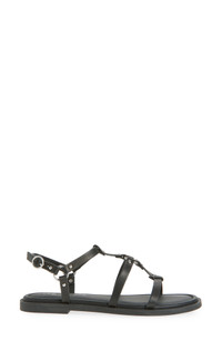 Brushed harness buckles and glossy studs highlight the sleek leather upper of a strappy sandal secured with an adjustable buckle closure. An OrthoLite® footbed provides optimal underfoot cushioning. Adjustable ankle strap with buckle closure OrthoLite footbed Leather upper and lining/synthetic sole Imported