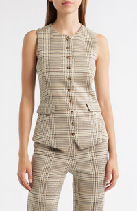 Wear alone or layer this fetching longline vest made from a stretch-enhanced ponte knit that will look as great at 5:00 as it did at 9:00. 25" length (size Small) Front button closure Jewel neck Front flap pockets 66% viscose, 30% nylon, 4% elastane Machine wash, dry flat Imported