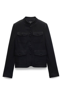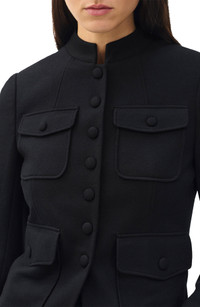 Covered snaps and plenty of pocket space add a tailored vibe to a waist-skimming wool jacket topped with a smartly polished collar. 23" length (size 4) Front snap closure Band collar Chest snap-flap patch pockets; front snap-flap patch pockets Lined 100% wool Dry clean Imported