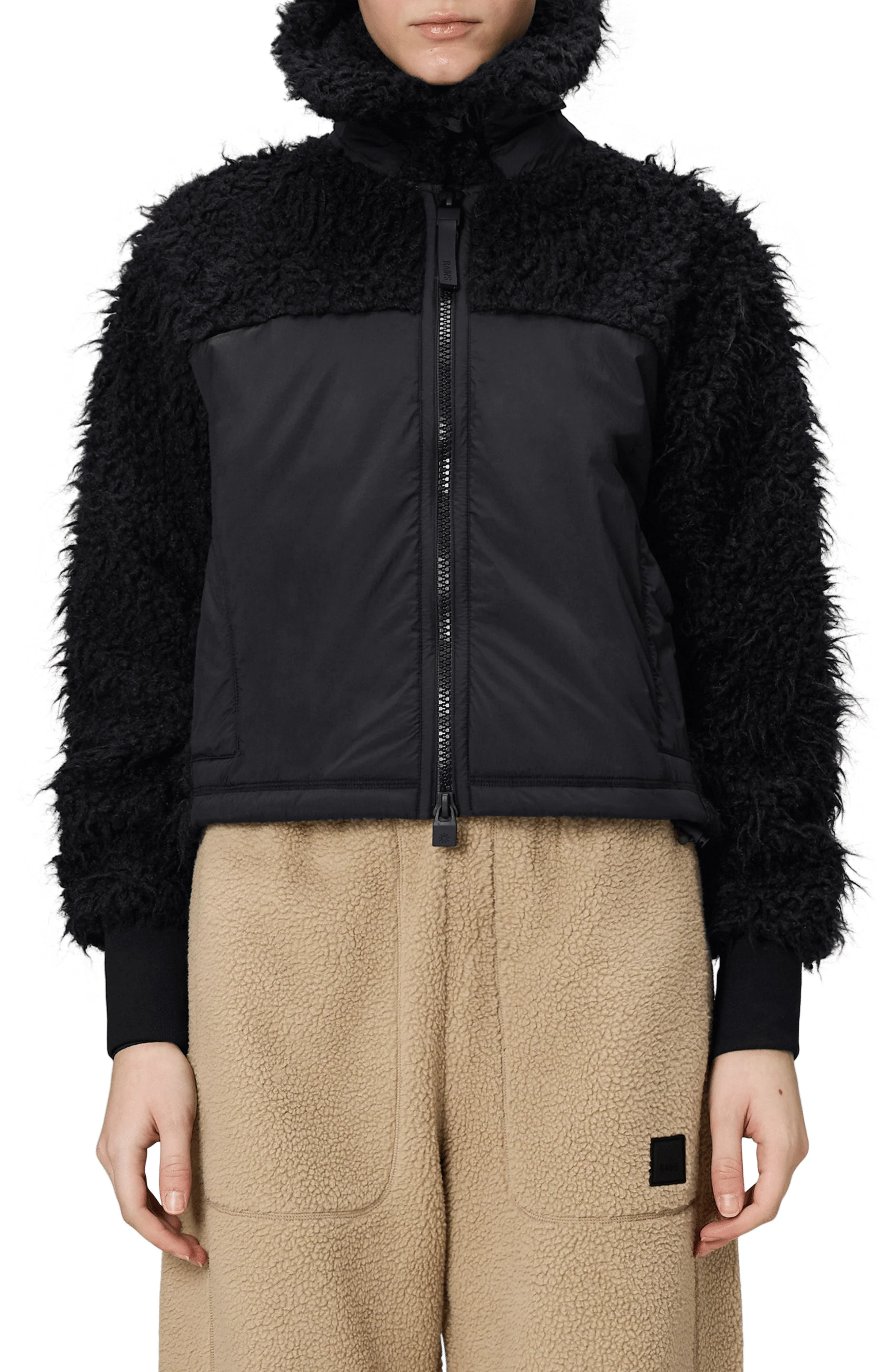 An insulated hood tops this substantial jacket that features placed shaggy fleece for interesting texture and is made for breathable warmth when the weather turns chilly. Front zip closure Fixed hood Long sleeves 60% acrylic, 40% polyester Hand wash, line dry Imported