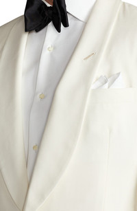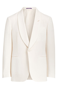 Classic in color, cut and composition, this cream-hued dinner jacket sets a polished course, tailored with a shawl collar and welt pockets from wool barathea. 30" length (size 40R) One-button closure Shawl collar Nonfunctional four-button cuffs Chest welt pocket; front welt pockets Side vents Cupro lining 100% wool Dry clean Made in Italy Men's Designer Clothing