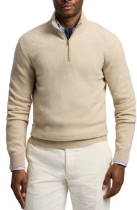 A brushed bird's-eye knit made of lightweight cashmere brings exceptional comfort to a sweater that's fashioned with a sporty stand collar and a short zipper framed in soft suede. 26" length; 42" chest (size Medium) Half-zip closure Stand collar Ribbed cuffs and hem 100% cashmere with leather trim Dry clean Made in Italy Designer Clothing
