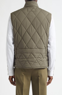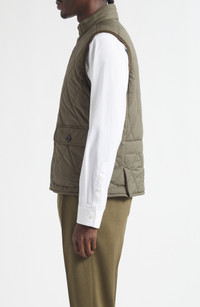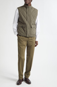 Corduroy trim and a quilted design with roomy pockets enhance the refined aesthetic of this barn-jacket-inspired vest made in Italy. It's insulated with innovative down fill that maintains the slim profile while offering ample warmth. Front zip closure with snap storm placket Stand collar Front button-flap patch pockets Lined, with 85% down, 15% feather fill 85% recycled polyester, 15% polyurethane Dry clean Made in Italy Designer Clothing