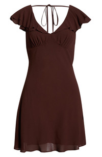 Fluttery ruffles enhance the whimsical romance of this Empire-waist minidress cut from lightweight georgette in a graceful A-line silhouette. Adjustable back tie closure V-neck Cap sleeves Lined 100% viscose Dry clean Imported