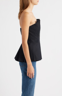 Sharp pleats through the waist create a flouncy peplum on this stretch-kissed cotton-twill top cut in a sleek, shoulder-baring silhouette. 16" length Hidden side-zip closure Strapless Lined 98% cotton, 2% spandex Dry clean Imported