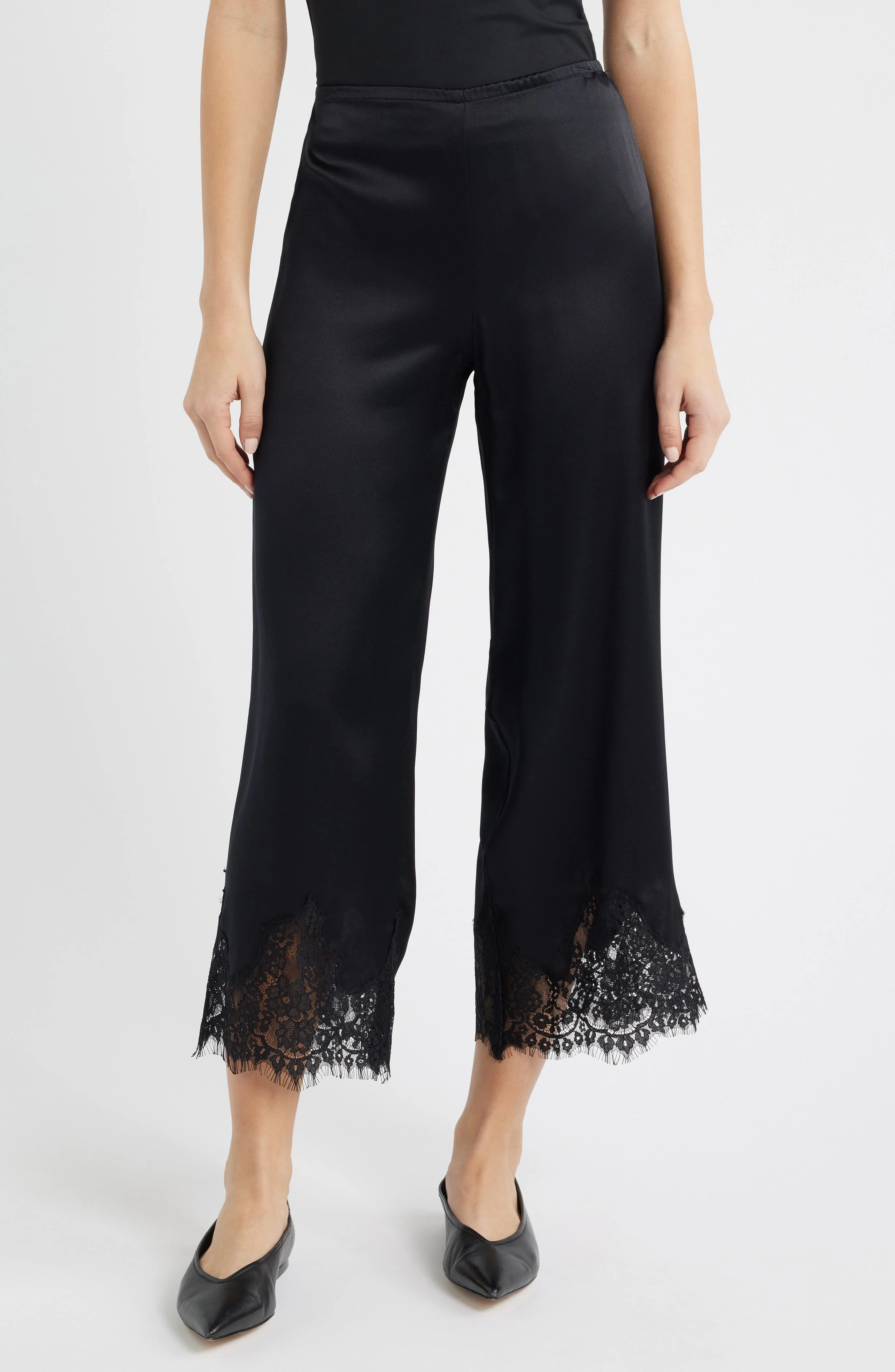 Fluid silk lends understated elegance to these relaxed pants finished with a delicate eyelash-lace hem for a soft, romantic contrast. Elastic waist 100% silk Dry clean Made in the USA