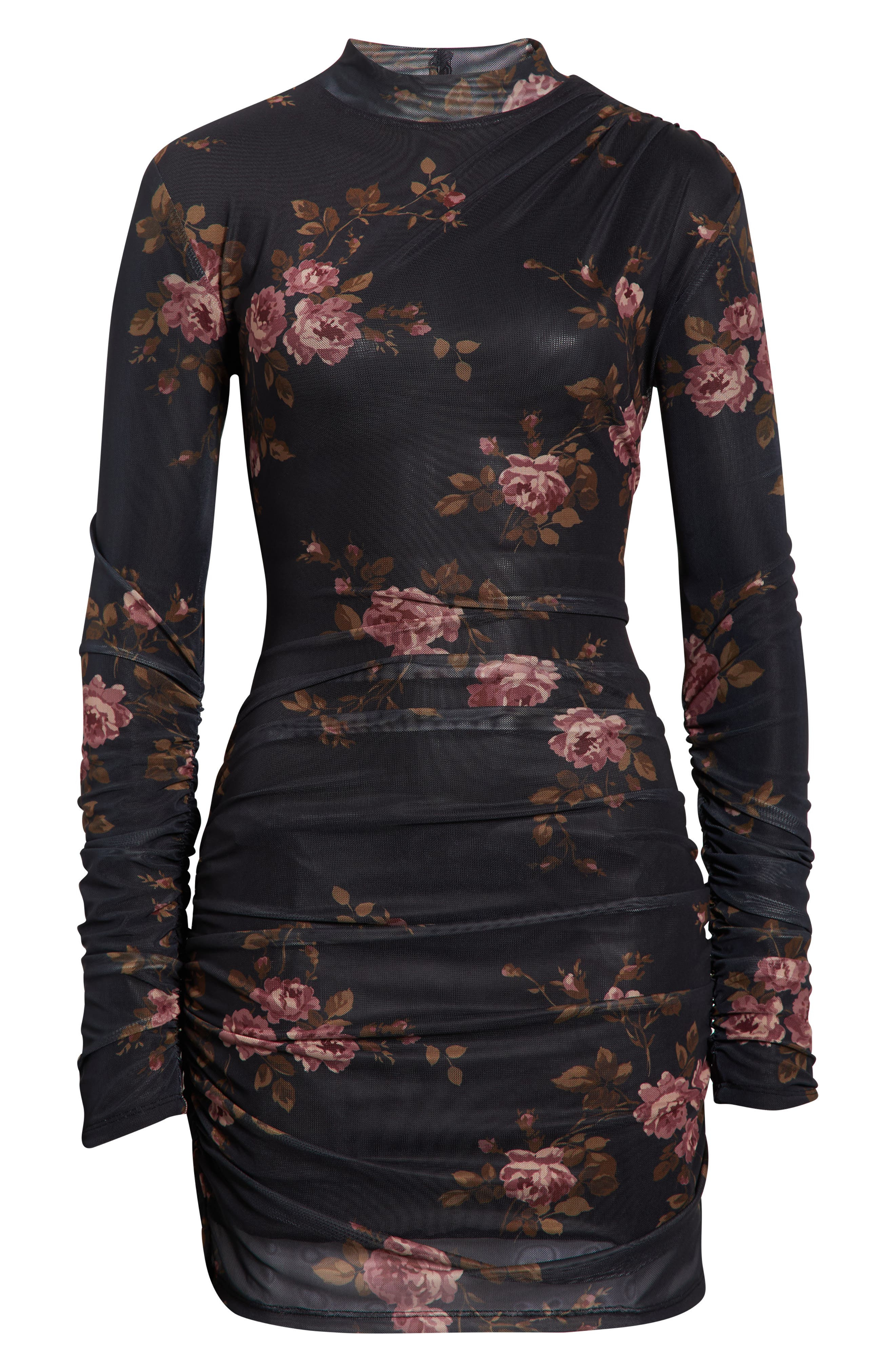 Allover ruching creates curve-hugging appeal on this party-ready mesh minidress topped with a mock neckline and covered in an eye-catching print. Slips on over head Mock neck Long sleeves Lined 93% polyester, 7% spandex Machine wash, dry flat Imported