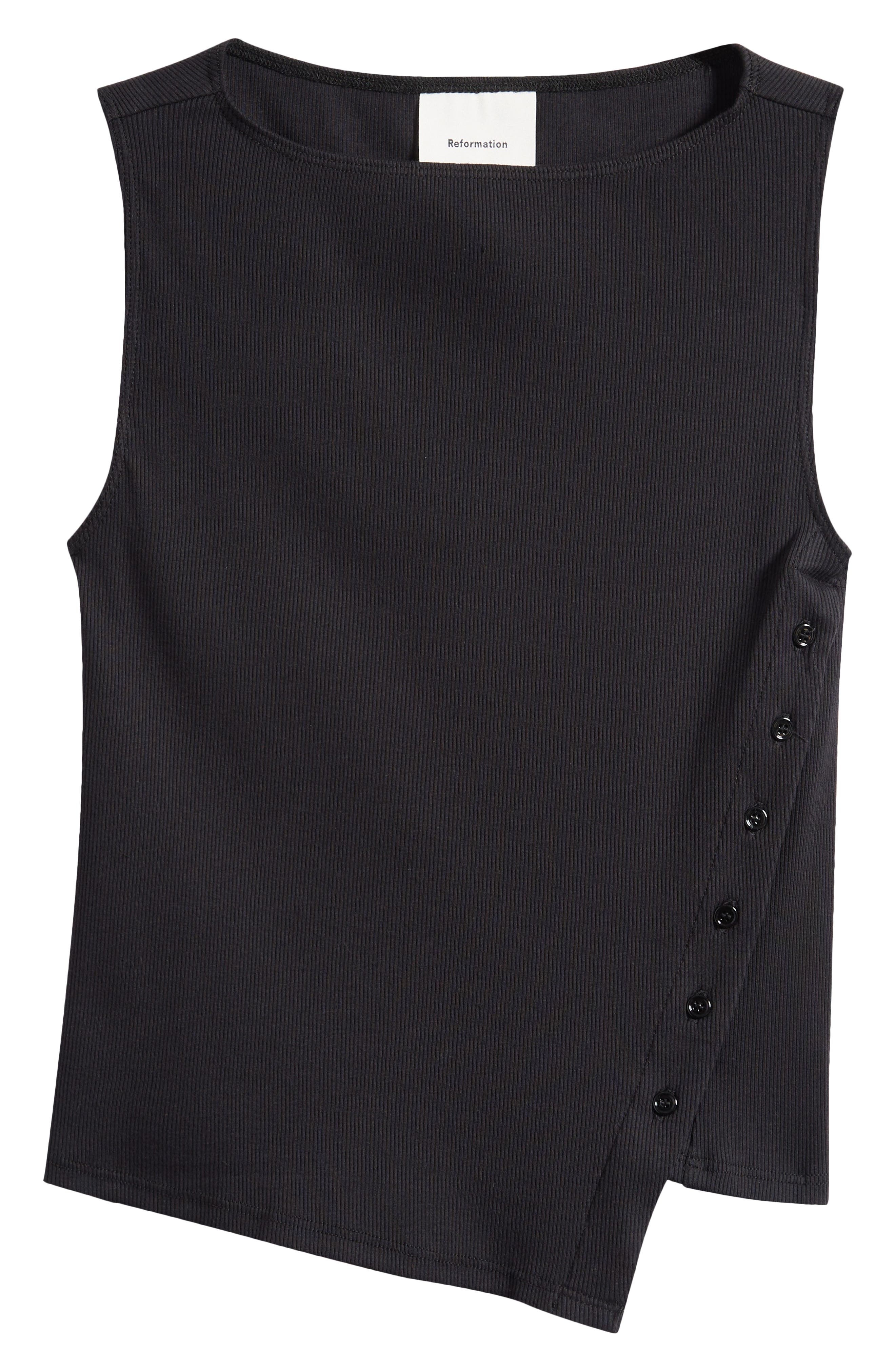 Buttons up the side highlight the asymmetric hemline of this casual-staple rib tank. Side button closure Scoop neck 97% organic cotton, 3% spandex Machine wash, tumble dry Made in the USA