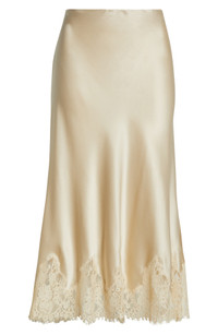 Elevated in glossy skin-skimming silk, this luxe midi skirt is romanced by intricate eyelash-trimmed lace. 100% silk Dry clean Imported