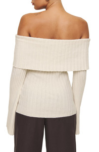 A blend of recycled cashmere and wool adds a luxuriously soft feel to this shoulder-baring fold-over sweater framed by fluted long sleeves. 23" center front length (size Medium) Off-the-shoulder neck Long sleeves 70% organic cotton, 30% recycled cotton Hand wash, dry flat Imported