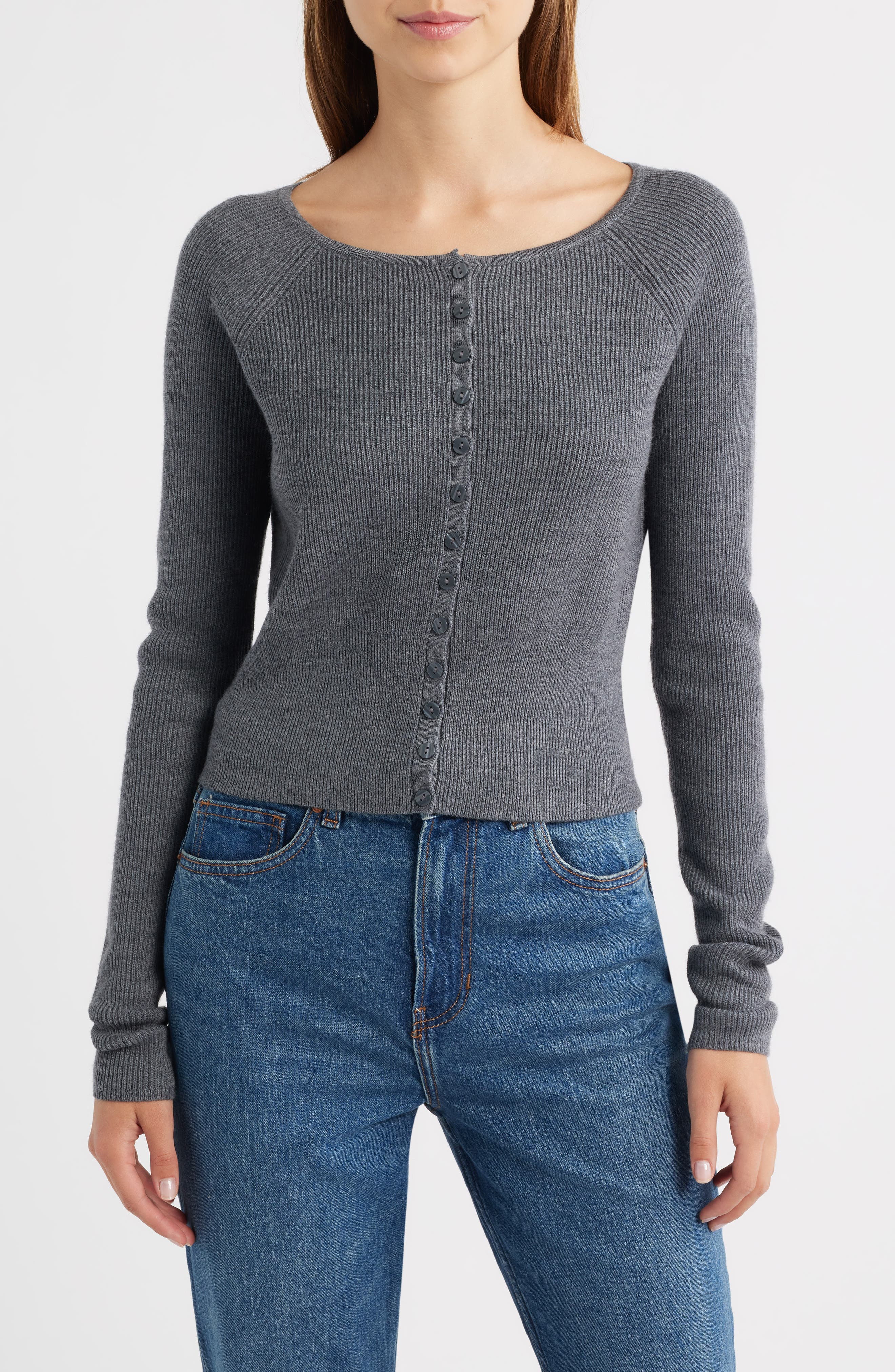 Top off your high-waist looks with this fetching ribbed cardigan knit from soft merino wool in a fit that's ideal for wearing solo. Front button closure Crewneck Long sleeves 100% wool Hand wash, dry flat Imported This brand has B Corp certification, representing business practices with emphasis on social and environmental performance, accountability and transparency This brand meets Nordstrom Responsible Brands criteria: brand adheres to responsible social and environmental practices