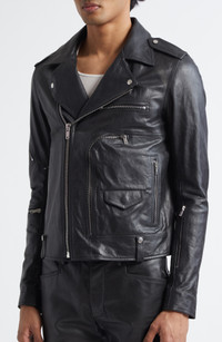 The avant-garde designer's dark rock 'n' roll aesthetic is epitomized in a calfskin-leather moto jacket tailored with a bevy of zip pockets—including a curved bauhaus-style pocket framing the lone snap-flap style. Asymmetric zip closure Convertible collar Zip cuffs Chest zip pocket; front zip and snap-flap pockets; vertical side-zip pockets; sleeve zip pockets Epaulets Cupro lining Leather Professional leather clean Made in Italy Designer Clothing