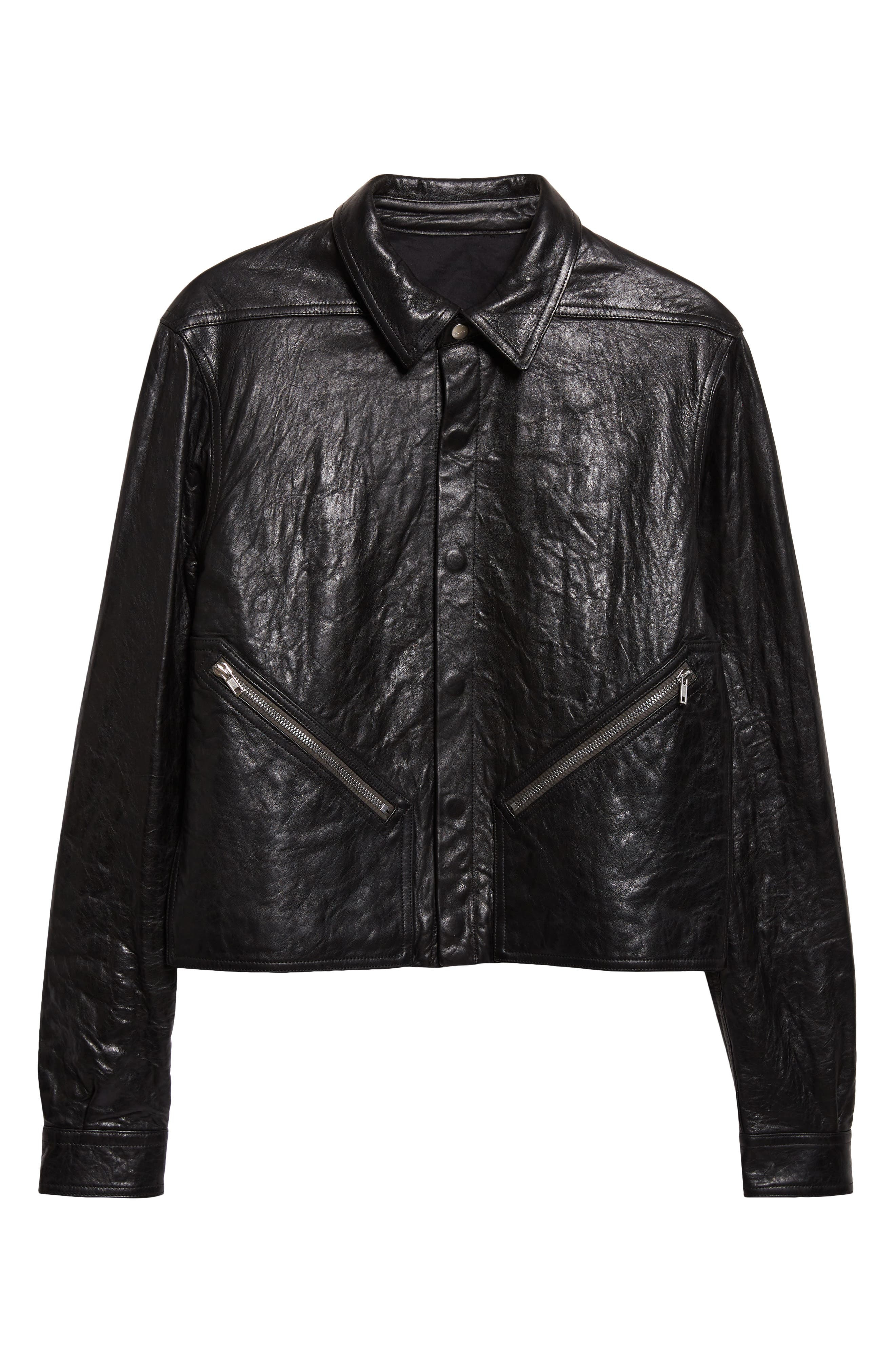 Rick's bent for the bold shines through the richly crinkled Italian leather and elongated zip pockets of this rocker-inspired jacket finished with house-signature level shoulder seams. Hidden-snap placket Spread collar Front zip pockets Lined Leather Professional leather clean Made in Italy Designer Clothing