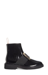 A puritan look rendered in luxe patent leather, this Chelsea boot is styled with a low, masculine heel and an iconic buckle strapped at the vamp. 1" (25mm) heel 5" shaft Pull-on style with elastic gore insets Leather upper and lining/synthetic sole Made in Italy Salon Shoes