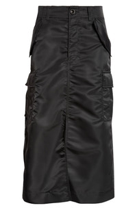 The division of duties is clearly designed into this midi skirt tailored with an all-function nylon-twill cargo front and an all-fashion pleated satin back. 34" length (size 3) Zip fly with button closure Front flap-slant pockets; cargo bellows pockets Back elastic waist Cupro lining, with 100% polyester fill 100% nylon with 100% polyester trim Dry clean Made in Japan Designer Clothing Asian & Pacific Islander Owned/Founded
