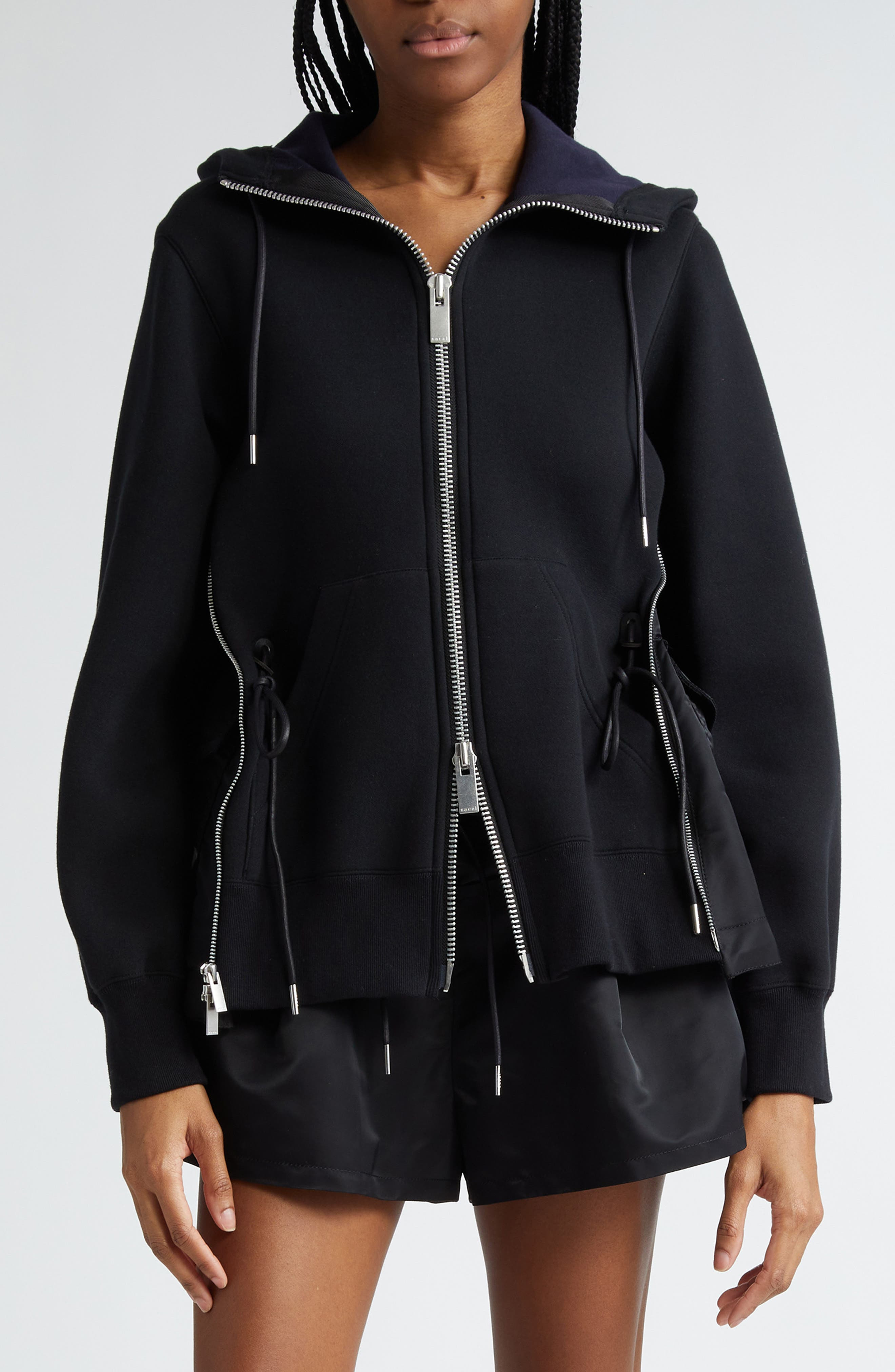 Comfy sportswear and classic military gear unexpectedly merge on a spongy hoodie that unzips at the sides to expose contrast nylon paneling. 23 1/2" length (size 1) Two-way front-zip closure Drawstring hood Split kangaroo pocket; side button-flap patch pockets Side zip gussets Drawcord waist and hem 62% cotton, 38% nylon Dry clean Made in Japan SPACE: A shop for emerging and advanced designers
