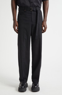 Crisp suiting fabric made with breathable wool brings polish and distinction to black flat-front pants relaxed with five-pocket construction and an incorporated belt. Cinching at the waist and tapering slightly down the legs, they bring a smart silhouette to your standout looks. Removable belt Zip fly Five-pocket style 70% polyester, 30% wool Dry clean Made in Japan Designer Clothing Asian & Pacific Islander Owned/Founded