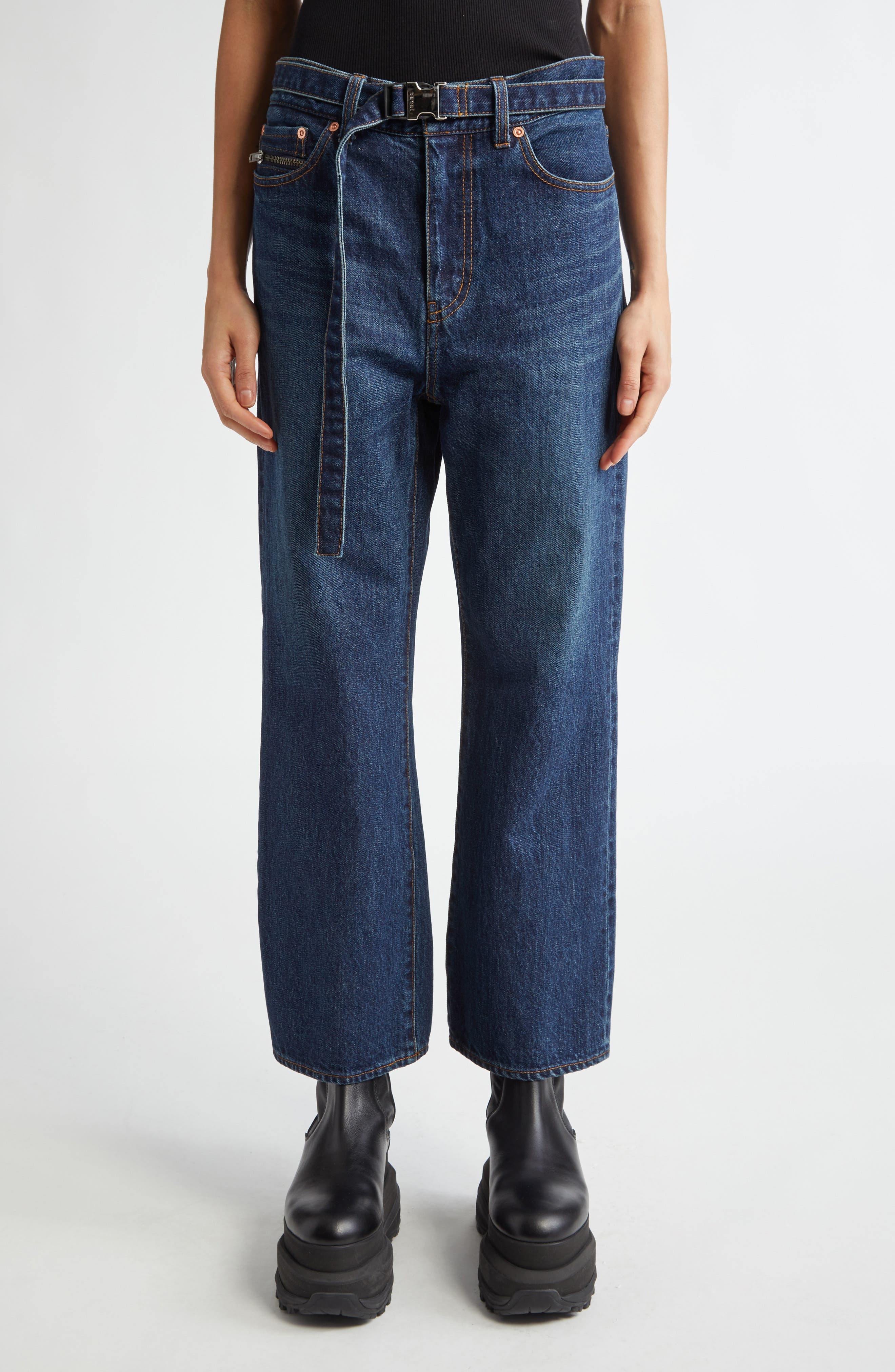 Chitose Abe blends a drapey squeeze-buckle belt and a zip-bisected coin pocket into the cropped silhouette of these bootcut jeans in nonstretch Japanese denim. 25" inseam; 17" leg opening; 11 1/2" front rise; 16" back rise (size 2) Zip fly with button closure Removable belt Five-pocket style 100% cotton Dry clean or machine wash, dry flat Made in Japan Designer Clothing Asian & Pacific Islander Owned/Founded