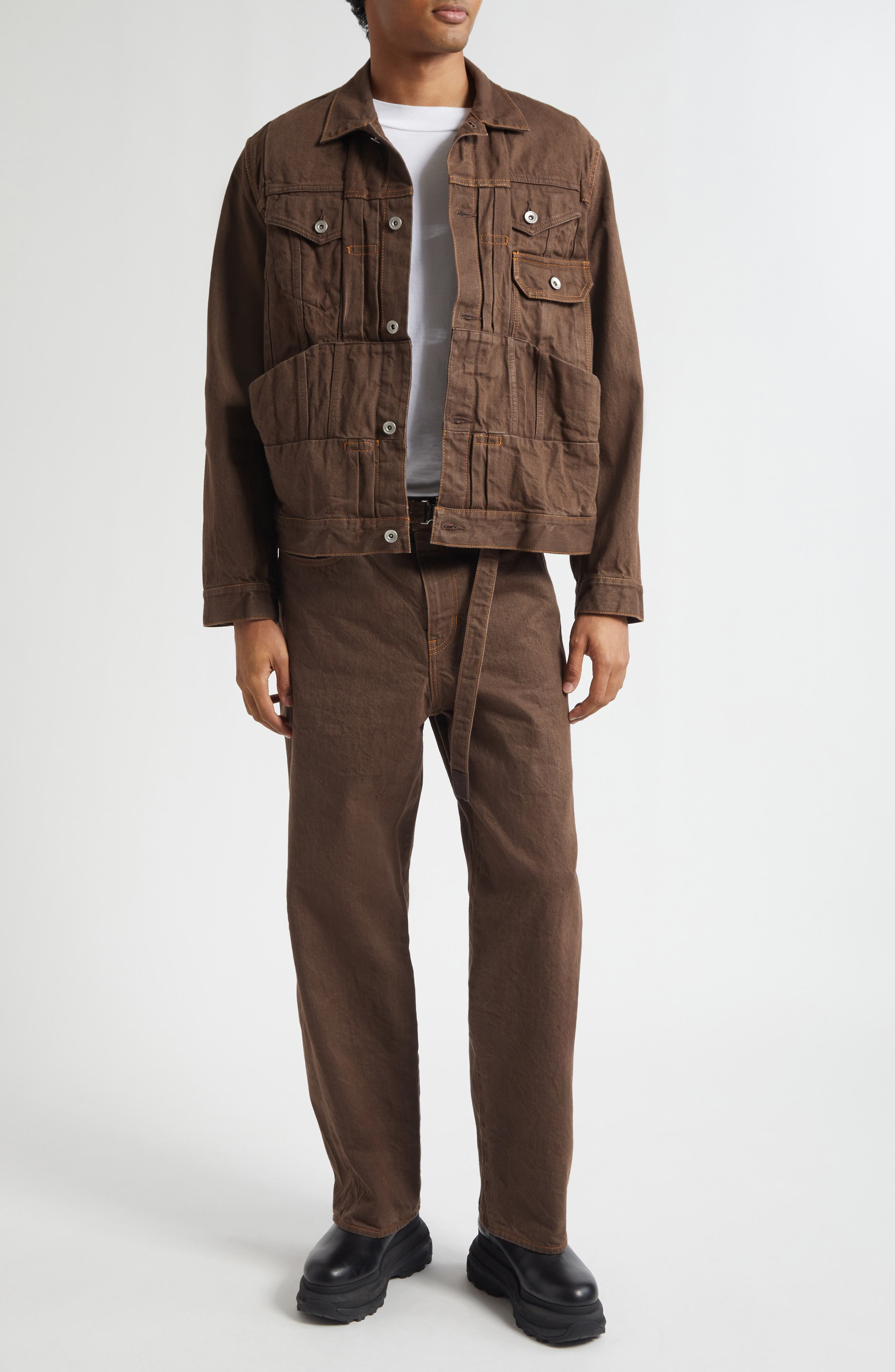 Chitose Abe's passion for hybrid aesthetics subtly manifests with this deep-chocolate denim jacket refreshed with a multitude of carpenter-style shelf pockets and artfully paneled-over chest pockets. Front button closure Spread collar Button cuffs Front button-flap patch pockets; front slip pockets 100% cotton Dry clean Made in Japan Designer Clothing Asian & Pacific Islander Owned/Founded